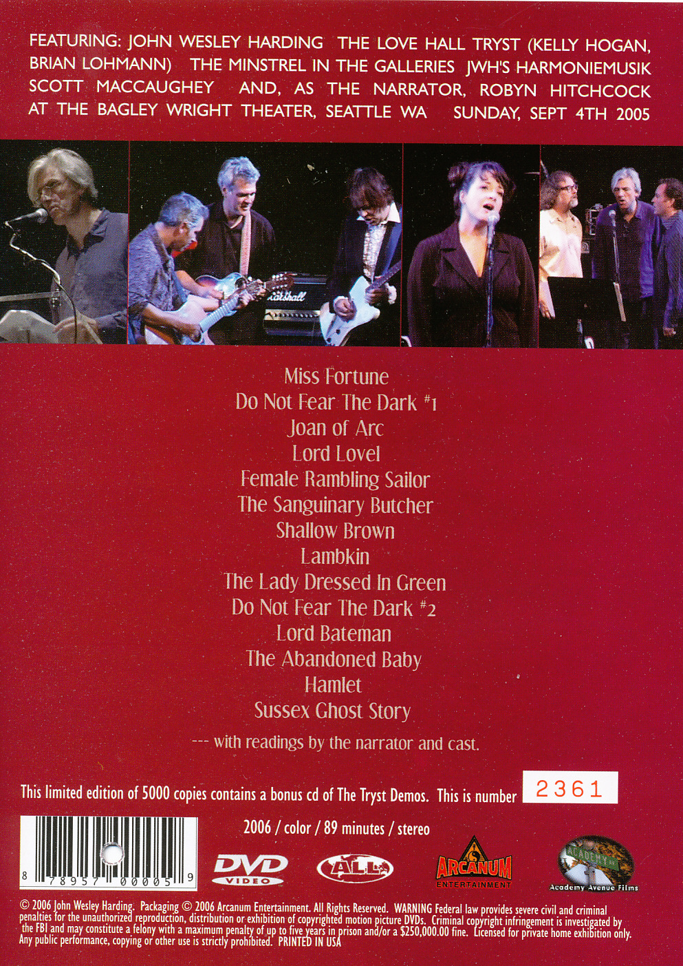 Recorded at Bagley Wright Theatre, as part of Bumbershoot Festival on September 4, 2005 Robyn does readings between songs and contributes vocals to 'Shallow Brown'