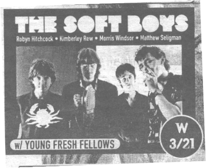 Watch the Young Fresh Fellows set for the first time .... I didn't realise how good they were ... then have a shower whilst Robyn sleeps on the top floor of the bunk-bed with Kimberley writing out set-lists (new changes from last night) in the corner .... The promoter comes backstage and I try to keep him out of the dressing room, not realising he is the promoter but Robyn wakes up just in time to prevent immediate cancellation of the show ... which is good, because the gig is great although I didn't particularly enjoy ending up as "baby" soft-boy when Robyn ran through the list for the audience .... then we play Rock and Roll Toilet and then spring it on the YFF that they have to play "Give it to the Soft Boys" for us as the second encore .... But "Tad is ill, he's gone home", so Morris sits in on the YFF sitting in on us, and is the only one to make a (small) mistake! Sounds great though, and afterwards Morris is looking pretty moved by the whole experience which he describes as "intense" ... he liked the breakdown in v3 of "Kingdom of Love " (so did I actually) and played Pervert brilliantly tonight .....