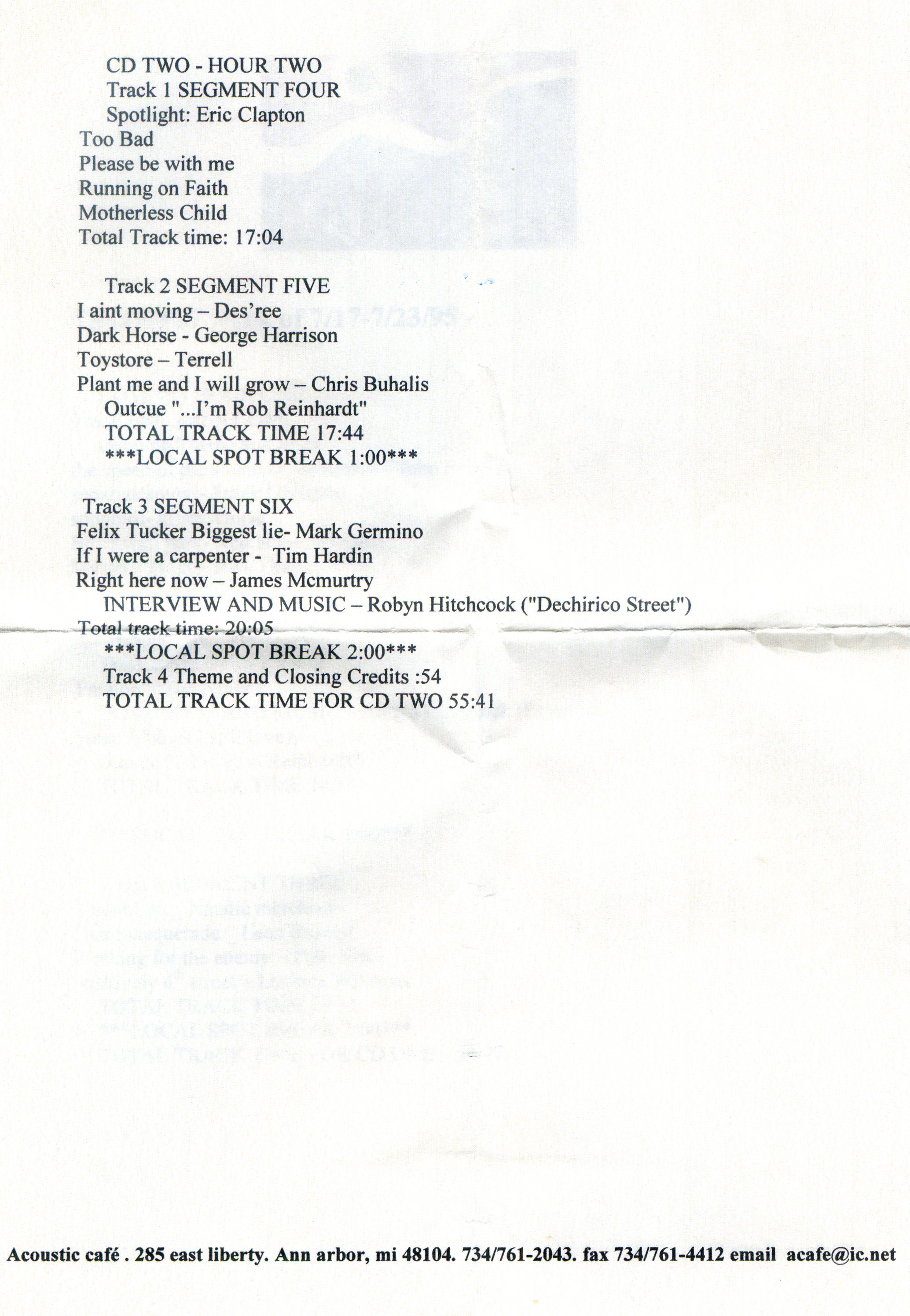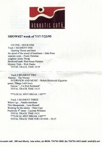 To start the second segment, both Robyn and Deni talk about the recording of these new songs. Robyn says that some of them were recorded in a graveyard in the UK while some others were recorded in a small cafe in Washington DC. He says that he and Deni are getting very proficient in the songs because they have played a lot of "2 a night" clubs during this tour. Then, Robyn says that he and Deni will be in the studio in July and August in Britain with an album out early next year. Then to close things, Robyn played "DeChiricco Street", once again with Deni on violin. I know that Acoustic Cafe taped more songs than just what was played because