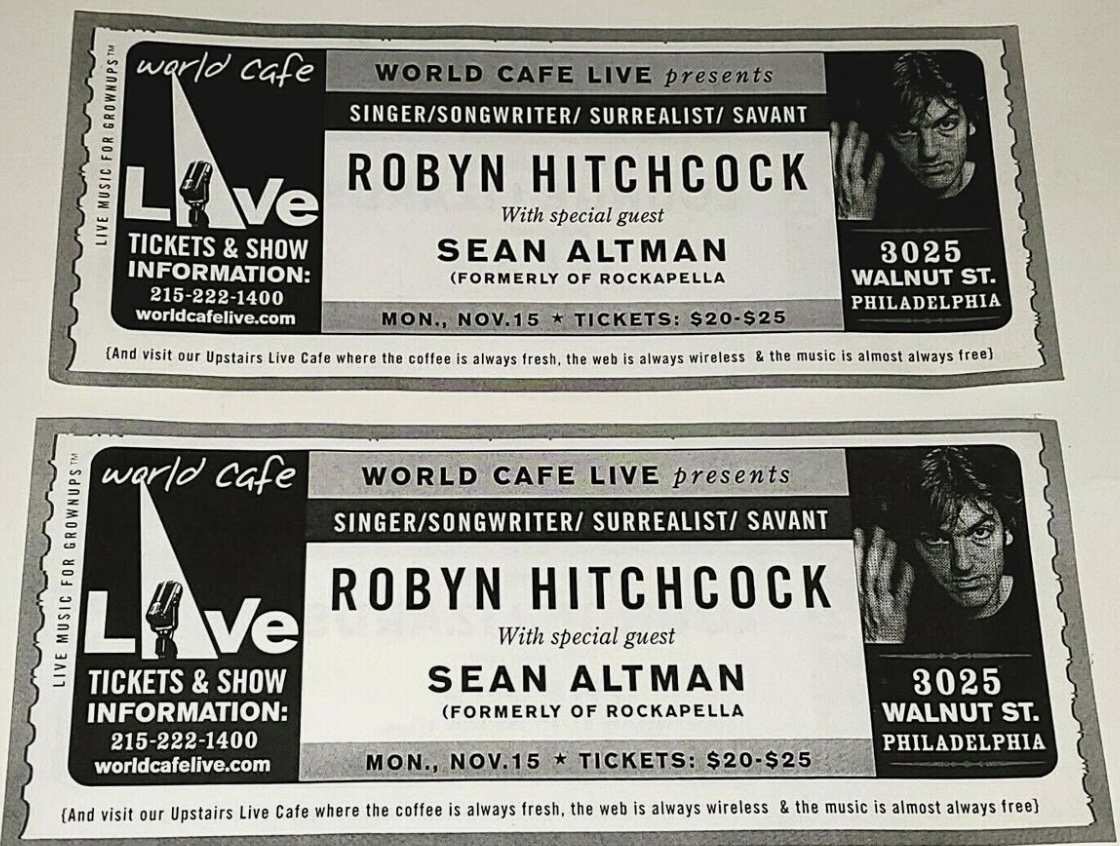 Delurking briefly to say that the show at the new World Cafe Live space was a lot of fun. Robyn had quite the frog in his throat at the beginning, but he limbered up. Vocally, that is physically, it was pretty funny to watch him bend over like a stork to pick up all the notes people kept putting at his feet. I'm terrible at remembering which songs were played in what order, so I'll leave that to others, but I can proffer a visual tidbit: a purple light shining on Robyn's silver hair turns it into a wonderfully Warholian lavender thatch.