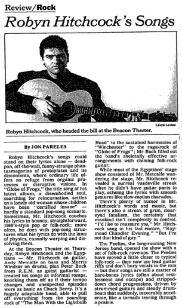 At the Beacon Theater on Thursday, Robyn Hitchcock And The Egyptians -- Mr. Hitchcock on guitar, Andy Metcalfe on bass, and Morris Windsor on drums (plus Peter Buck from R.E.M. as guest guitarist) -- treated his songs as informal romps, knocking them off as if their tempo changes and unexpected episodes were as basic as Chuck Berry. It's a hugely adaptable band, able to pull off everything from the pounding Rock of "The Man With The Lightbulb Head" to the sustained harmonies of "Winchester" to the Raga Rock of "A Globe of Frogs". Mr. Buck filled out the band's skeletally effective arrangements with chiming Folk Rock guitar.