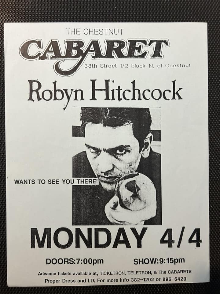 Robyn Hitchcock And The Egyptians perform Monday night at the Chestnut Cabaret, 3801 Chestnut St., Philadelphia. For information, call 896-6420 or 382-1201.