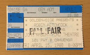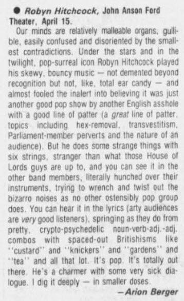 Our minds are relatively malleable organs, gullible, easily confused and disoriented by the smallest contradictions. Under the stars and in the twilight, pop-surreal icon Robyn Hitchcock played his skewy, bouncy music not demented beyond recognition but not, like, total ear candy and almost fooled the inalert into believing it was just another good pop show by another English asshole with a good line of patter (a great line of patter, topics including hex-removal, transvestitism, Parliament-member perverts and the nature of an audience). But he does some strange things with six strings, stranger than what those House of Lords guys are up to, and you can see it in the other band members, literally hunched over their instruments, trying to wrench and twist out the bizarro noises as no other ostensibly pop group does. You can hear it in the lyrics (arty audiences are very good listeners), springing as they do from pretty, crypto-psychedelic noun-verb-adj.-adj. combos with spaced-out Britishisms like "custard" and "knickers" and "gardens" and "tea" and all that lot. Its pop. Its totally out there. He's a charmer with some very sick dialogue. I dig it deeply in smaller doses.