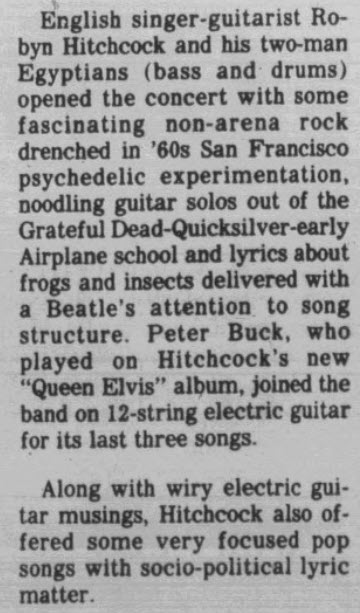 English singer-guitarist Robyn Hitchcock and his two-man Egyptians (bass and drums) opened the concert with some fascinating non-arena rock drenched in 60s San Francisco psychedelic experimentation, noodling guitar solos out of the Grateful Dead-Quicksilver-early Airplane school and lyrics about' frogs and insects delivered with a Beatles attention, to song structure. Peter Buck, who played on Hitchcock's new Queen Elvis album, joined the band on 12-string electric guitar for its last three songs.