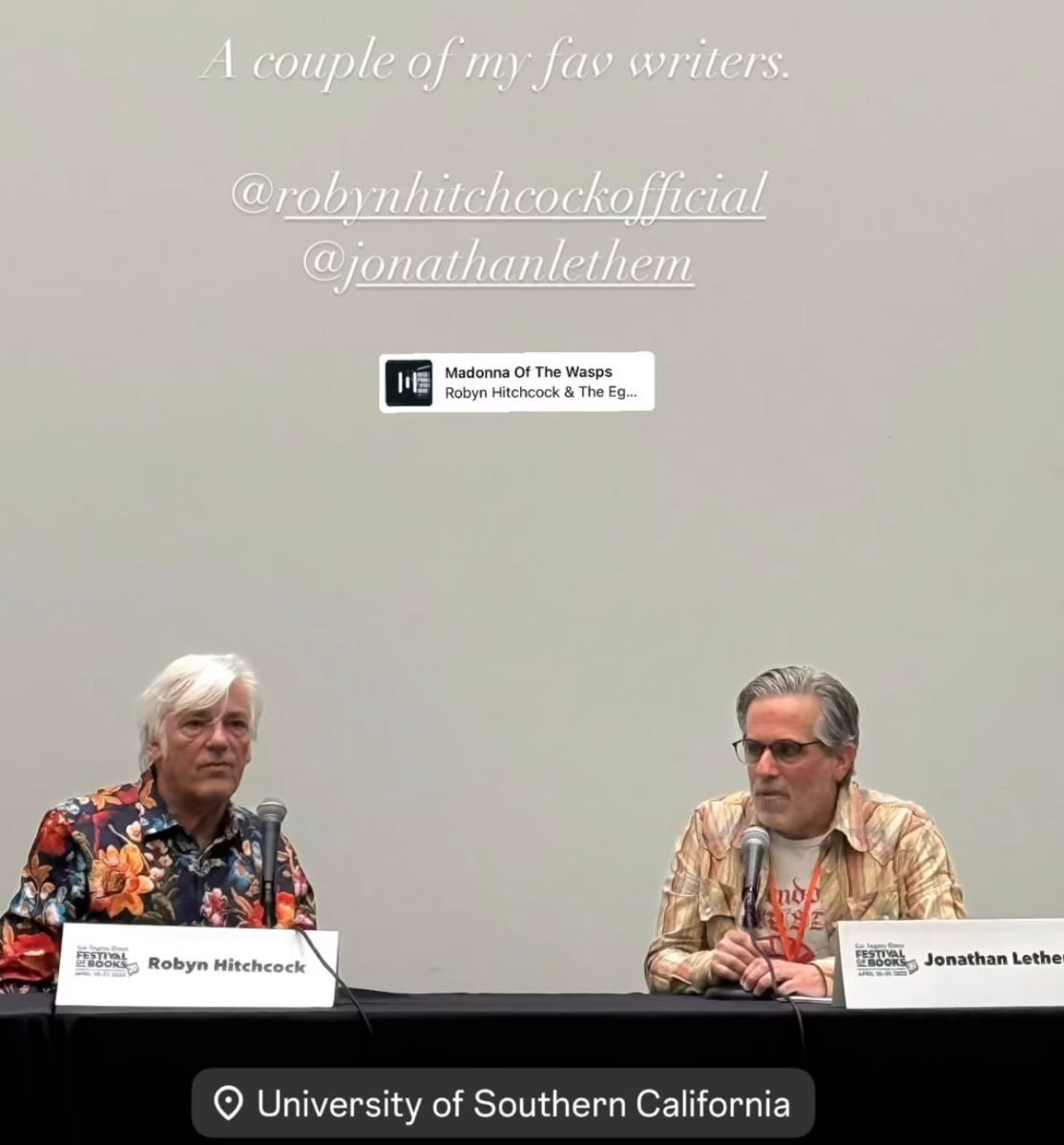 Here I am at the LA Times Festival of Books with the legendary writer Jonathan Lethem. He and I were in conversation in the green pastures of the University of Southern California, a few traffic jams away from Hollywood. It was great to finally meet Jonathan; we’re both familiar with each other’s work. Officially we were discussing my book “1967: How I Got There and Why I Never Left”, but the dialogue spread as usual across the enchanted lake of psychedelia, and up the slopes of Mount Dylan. Thanks to Akashic Books for arranging the event, and the folks at the Festival for letting it happen. Viva!
