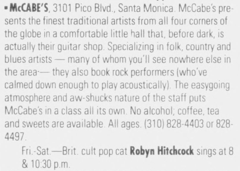 LA Weekly dated September 22, 1994Discrepancies in the setlist and the review - songs 17 - 19 on are added on based on below review and are thus likely out of sequence.