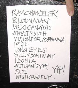 The set was long-ish with two encores and deviated greatly from the posted set list. Omissions? The Yip Song and everything from Luxor. Four or five new songs, and while I'm completely shattered right now and on the verge of falling asleep, what I remember of the set included Raymond Chandler Evening, 1974, One Long Pair of Eyes, Strawberry Fields Forever, Visions of Johanna, New Age, and the GLP-esque Sound & Vision/In Love w/a Beautiful Woman (?) montage.