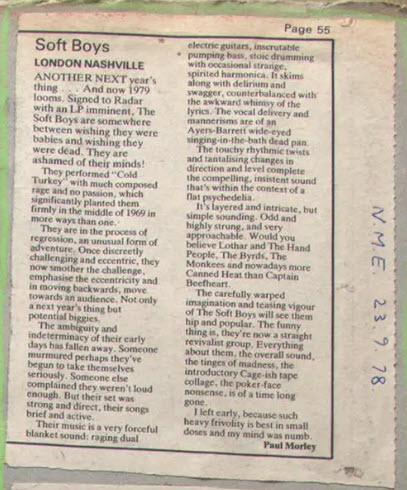 Another next year's thing.... And now 1979 looms. Signed to Radar with an LP imminent, The Soft Boys are somewhere between wishing they were babies and wishing they were dead. They are ashamed of their minds!