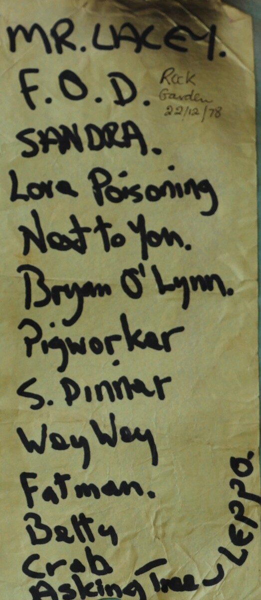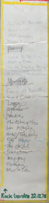 Kimberley Rew's Soft Boys Scrapbook: From the Rock Garden, another baffling set list - starts in I don't know whose handwriting with three British folk rock numbers - The Gallant Poacher, Poor Will and the Jolly Hangman and Mr Lacey - then something illegible, then something crossed out, then Love Poisoning, the Asking Tree, then a medley of Bonde Mteko Stomp (Bonde Mteko was the name of a cottage I briefly rented outside Cambridge, where the band could rehearse), a medley of Horns (Horns Large Horns, an acapella piece from the Albion Country Band) [note: seems to originally be a traditional piece called So Selfish Runs the Hare - bc] a medley of something illegible and [Arabian] Takeaway, then Face of Death, then in Robyn's Handwriting Leppo, Pigworker, Sandra, the Asking Tree, Love Poisoning, a medley of Horns Large Horns and (African) Takeaway, [note - looks like Arabian Takeaway, as per ACoB liner notes -bc] the Rat's Prayer, (Do) the Chisel, School Dinner Blues, Wey Wey (Hep a Hole), Fatman('s Son), (Let Me Put It) Next to You. Does the second part replace the first part (without actually removing it from the list?)