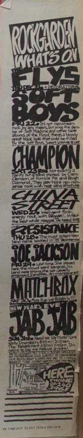 I have no specific recollection of individual Rock Garden gigs - we played there several times with Andy and Matthew - but the actual set list is clearly from Face of Death on...14 songs sounds about right. Don't remember doing Horns Large Horns/ Arabian Takeaway at all