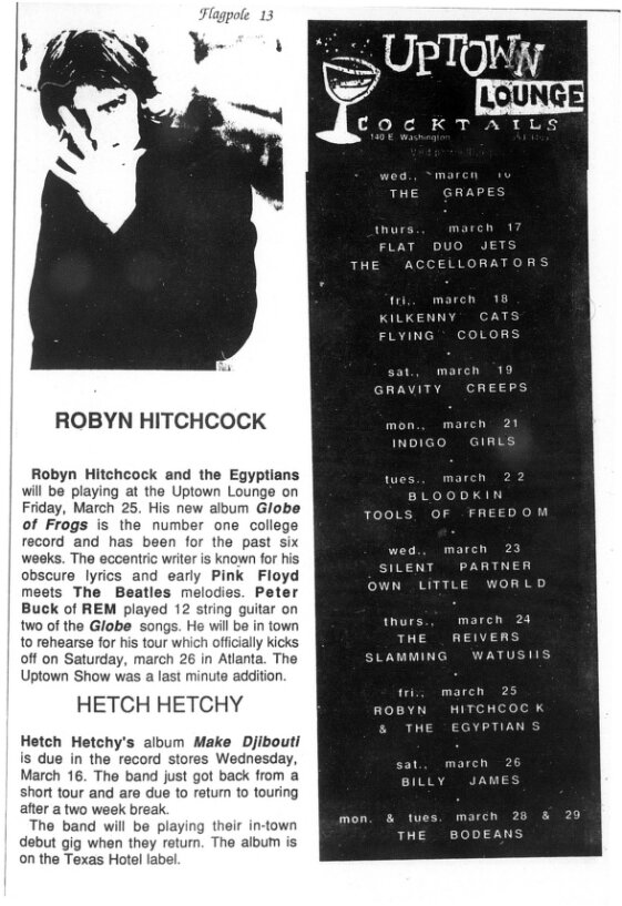 It is possible Robyn's memory recounted in the following article is from this gig, although he remembers it as being at the 40 Watt. There is a gig at an