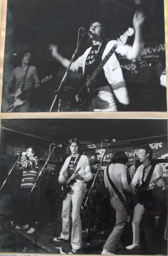 At the Hope and Anchor, I'm playing a Telecaster belonging to our sound engineer Ivan Carling (look him up). In the next photo I'm inflicting a "rock" guitar pose on Andy. Jim Melton in stripy jumper. Robyn's T-shirt reads "Where are the Prawns" (song title).