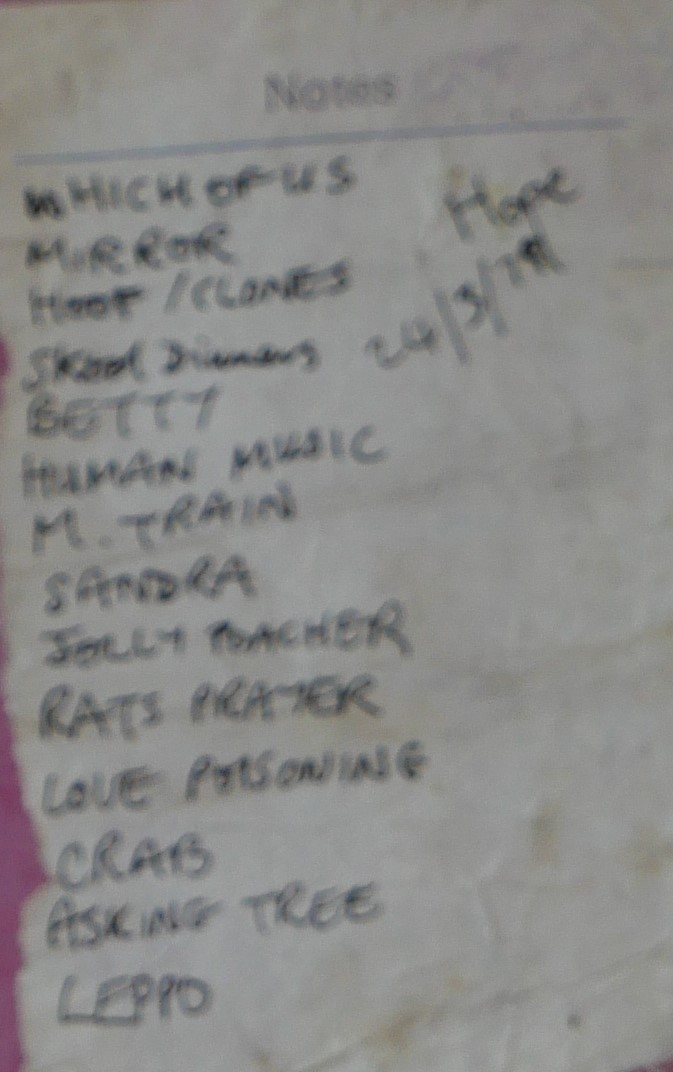 Kimberley Rew's Soft Boys Scrapbook. Lee Cave-Berry provided the setlist image. This is the first known gig to feature Muriel's Hoof/Rout of the Clones with its final title (rather than referring to it as Bryan O'Lynn).
