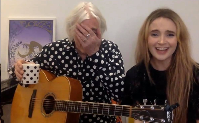 Emma, putting on her “gravitas face,” sings the requested Prince classic ‘Nothing Compares 2 U.’ Emma wonders if they shouldn’t do a 70’s Theme show. RH replies “they felt dismal at the time, but now seem…” A global pandemic puts the yucky excesses of the 70s in their place, I think. But Emma is undaunted. “Can I get you in one of my onesies? Who’d you be in ABBA?” RH speculates he’d be “the darker haired woman or the least beardy man.”