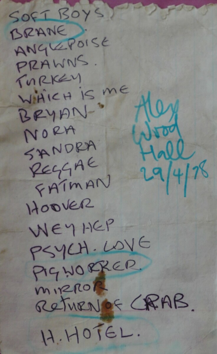 per Nick Bonny this may have been billed as "Robyn Hitchcock" but the setlist, containing many full-band songs, indicates the presence of the other Soft Boys. Hear My Brane, Pigworker and Heartbreak Hotel are circled, possibly indicating the use of strobe lights during these numbers.