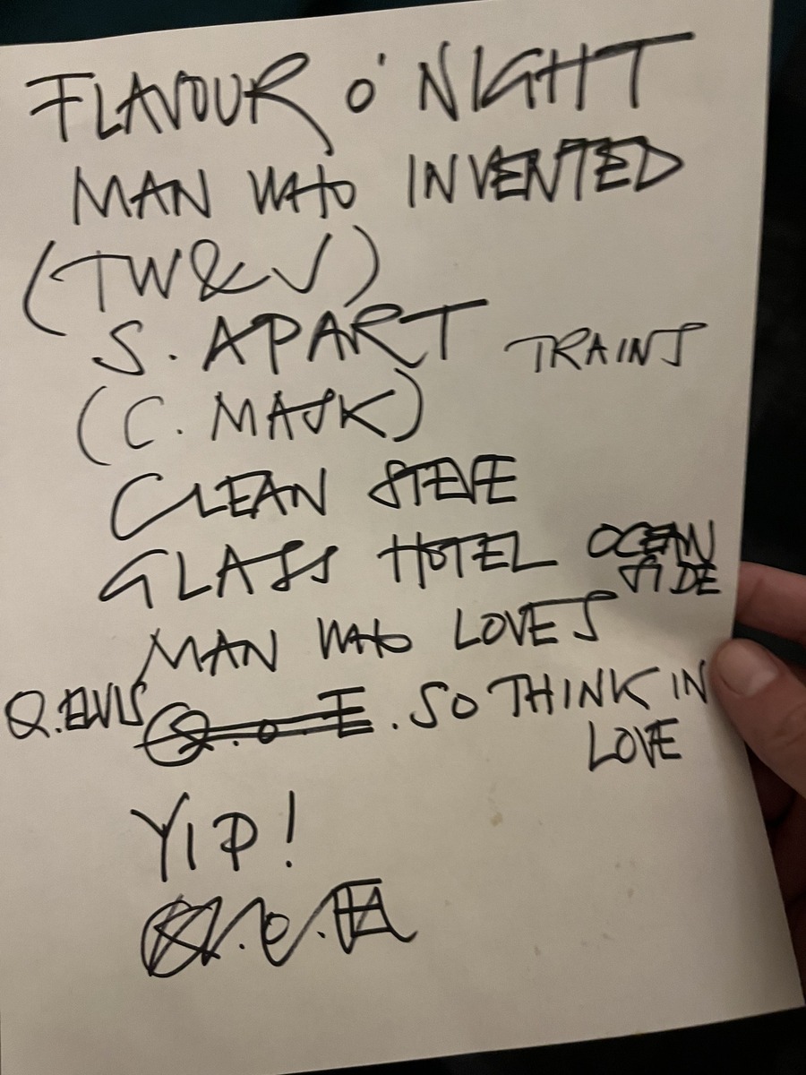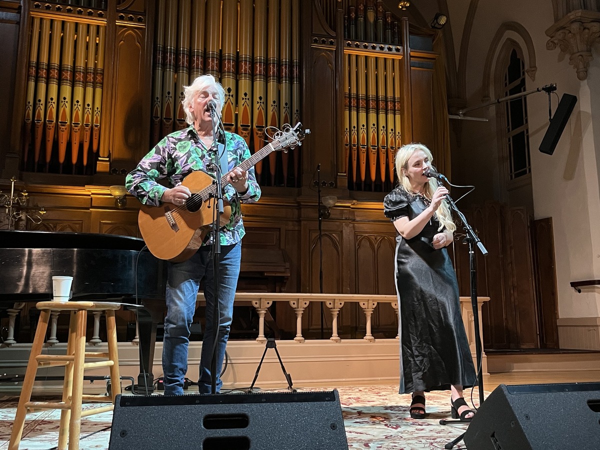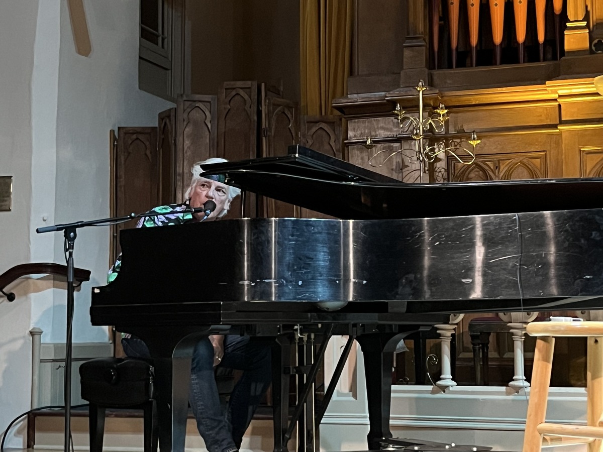 The evening was divided into two sets separated by an intermission. All told, Hitchcock played for nearly 135 minutes, mostly on the acoustic guitar. He began the second set on the piano, playing “Flavour of Night,” “Ted, Woody and Junior” and “Somewhere Apart” before moving back to guitar. Emma Swift, Hitchcock’s partner, joined him for the final portion for a handful of songs, adding rich vocal texture to selections such as “Glass Hotel,” “Oceanside” and “Queen Elvis.” Swift also kept up with Hitchcock’s oft-dislodged banter, giving him a hard time for being a technophobe and stretching out a joke about her love for the viral hippo baby, Moo Deng.