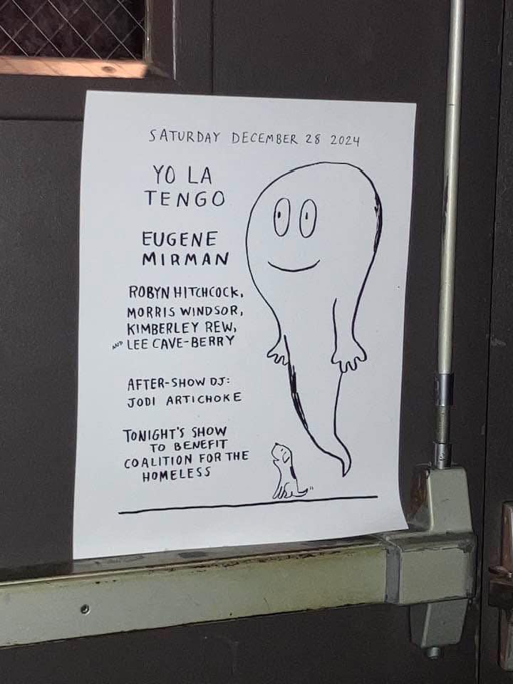 Eugene Mirman, who is old friends with both Yo La Tengo and Robyn Hitchcock, was the night’s comedian; YLT’s Georgia Hubley made the mix CD sold at the merch table; and Jodi Artichoke was the post-show DJ. Proceeds benefited Coalition for the Homeless.