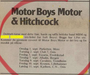 [Robyn] did a short Norwegian tour, split with Motor Boys Motor. Don't know if they also had gigs elsewhere in Scandinavia on this tour. The last show was at Kjelleren (or whatever it was called at the time) at Chateau Neuf, trying to remember where the first one was. From memory, their last song, the encore was The Doors' The End (with slightly changed lyrics).