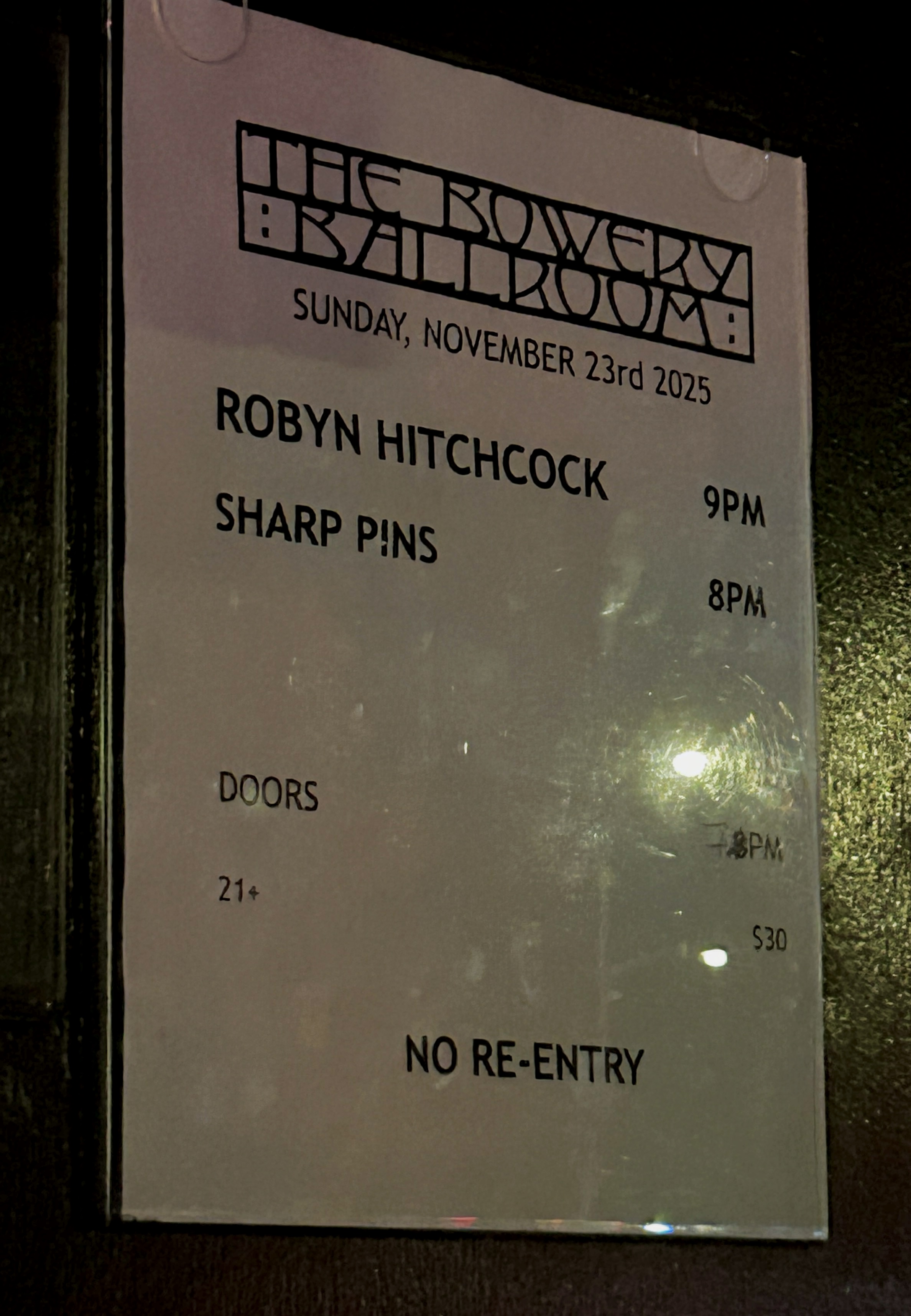 And if all that wasn’t enough, the three-song encore (in which the full band was joined by none other than Lenny Kaye, who regaled the audience with the story of seeing The Soft Boys at the Mudd Club back in 1980 on their only U.S. tour) started with “I Wanna Destroy You” (which Hitchcock introduced as a protest song against human nature) and ended with two previously unheard covers, The Beatles/John Lennon-penned classic “And Your Bird Can Sing” alongside Bob Dylan’s “Maggie’s Farm” (later memorably covered by The Specials in 1981). On literally every other night of this short U.S. tour, Hitchcock has covered “A Day in the Life” and “Dear Prudence” along with “All Along the Watchtower,” (perhaps practice for his upcoming show net month in the Hudson Valley where he will cover the entirety of Dylan’s