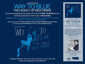 Online review by The Up ComingIn 2009, influential American record producer Joe Boyd amassed artists and friends to help celebrate the works of English singer-songwriter Nick Drake, creating an all-star team of performers to record cover versions of songs on Drake’s remarkable compilation album Way to Blue. The album that was originally produced by Boyd and released in 1994 includes songs taken from Drake’s original three albums and one from Time of No Reply.