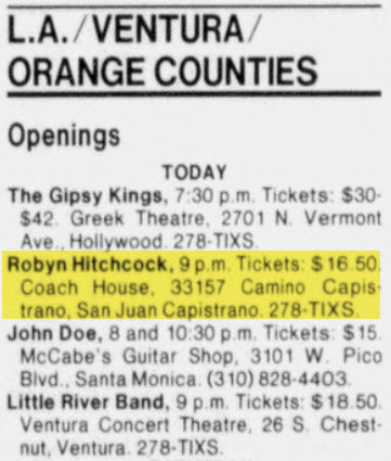 The concert's semi-acoustic mode showcased fine all-around instrumental craftsmanship and beautifully woven harmonies as Hitchcock's sidekicks created the perfect, lush bed for his own thin, nasal vocal leads -- which made up in melodic reach what they lacked in body and power. It took no thinking cap to understand the beauty of such songs as "Heaven" and "Wax Doll", to feel the wistful sense of loss in "Madonna Of The Wasps", to get caught up in the hothouse Eastern mysticism of "A Globe Of Frogs", or to appreciate the energizing Buddy Holly kick behind "The Yip Song" (one of several new, unrecorded songs Hitchcock played).