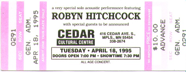 The post below, from the fegmaniax listserv in 1995, contains an account of an interview before this gig at the Cedar Cultural Center and a brief account of the gig itself. The review was featured in _Cake_ magazine and is by Hap Mansfield. I have left the email header intact for historical interest.