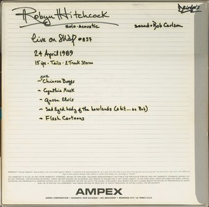 Robyn debuts a number of songs that would be recorded for Eye later in the year. Cynthia Mask has very different lyrics to the recorded version and Robyn actually says it is made up during the session, but this is likely in response to his banter with O'Donoghue to "play something he hasn't written yet". He introduces Flesh Cartoons as being the title track of a possible upcoming album, "if he finishes it."