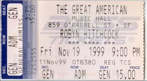All through the SF show, Robyn kept stepping on his guitar cables, often resulting in the acoustic pickup being pulled out. This lead to a running joke about "reinsertion" (Jesus was resurrected, redeemed, etc., but he was never reinserted.) When he did the last song of the first encore, he stepped on the cord to his guitar, switched to Tim's guitar and had similar problems. So he picked up his harmonica and told the band he'd go it alone (w/o guitar). So rather than do a song, he when into one of his stories about a dog going through a door, running into its otherself, its shadow turning into a cat, an evil onion a bottle of Aqua Velva (he thought it was Aqua Velva, he eye sight is getting worse and he couldn't read the label). Whenever he needed a sound effect, he would point to someone in the band and they would provide a little rift.